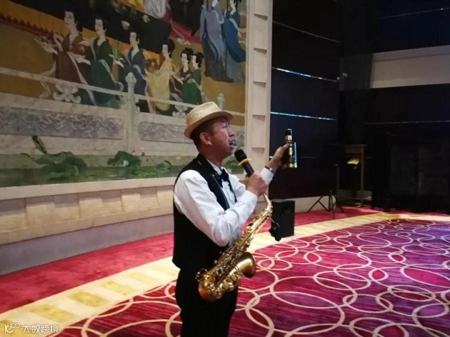 山西省国际文化交流中心理事王夏生握着华酒演奏萨克斯