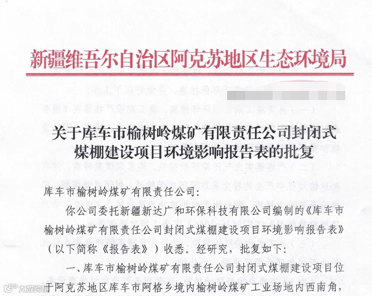 榆树岭煤矿:封闭式煤棚建设项目环境影响报告表获批复