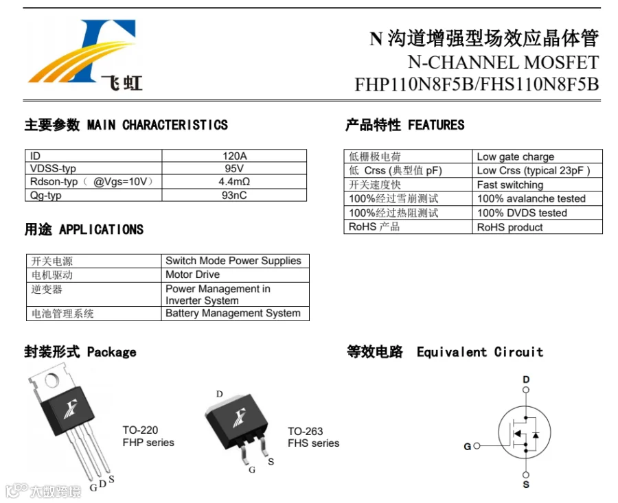 来看看飞虹这款FHP110N8F5B的具体产品参数,具有147A、85V的电流、电压, RDSon) = 5.5mΩmax) ,最高栅源电压@VGS =±20 V,100% EAS测试,100% Rg测试,100% DVDS测试,极低的FOMRDSON*Qg),极低的输入电容的特点。