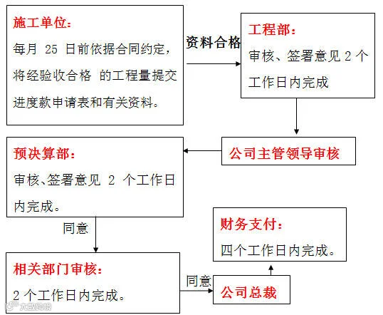 3、次月15日财务支付工程款。(原则上每月只办理一次工程款审批,如果需要在月初或月末支付,需要项目部经办工程师通过邮件向财务负责人、主管领导报告,获审批同意后才可执行,并同时抄送给项目成本人员和成本部经理。)