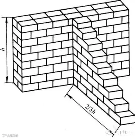 砌筑时砌体转角或纵横墙交接处,应同时砌筑,如不能同时砌筑的临时间断处,应留斜槎。实心砌体的斜槎长度,应不小于临时间断处砌体高度的2/3。见图。