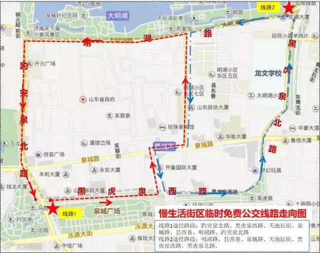 第二条是环明湖路、县西巷、泉城路、天地坛街、黑虎泉西路、黑虎泉北路。