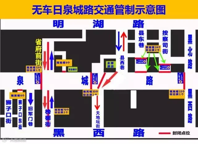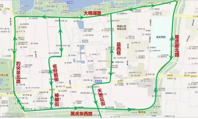 驻区车辆可通过大明湖路、黑虎泉北路、黑虎泉西路、趵突泉北路进入县西巷、天地坛街、榜棚街以及省府前街出行。