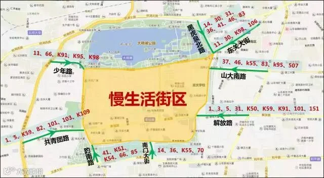 慢生活街区体验期间,大明湖路、黑虎泉北路现状为双向四车道。将最外侧机动车道改为节假日公交专用道。