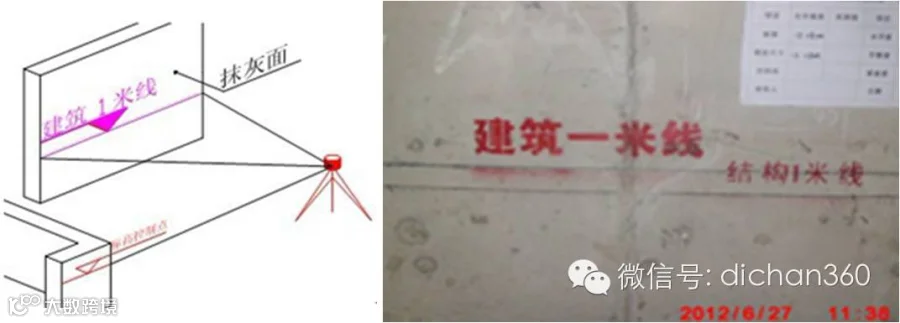 2、抹灰完成后在墙面补弹出建筑1m线。