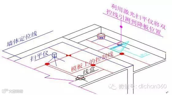 (2)楼层混凝土浇筑完成后采用激光铅垂仪将轴线控制网的4个控点传递至板面,并依次弹线,形成楼层主控线。