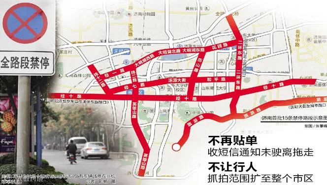济南对市区“四纵四横”15条禁停路段的违法停车进行两月集中整治,在这15条道路违停将被罚款100元、计3分: