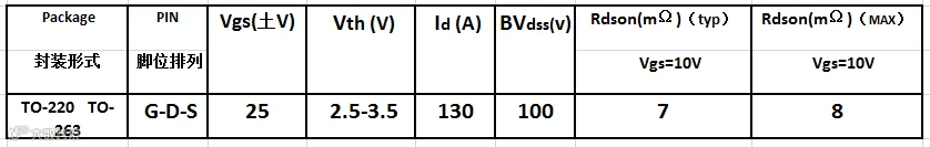 在产品参数方面,以TO-220 、TO-263封装,脚位排列是 G-D-S,其他参数看这里:
