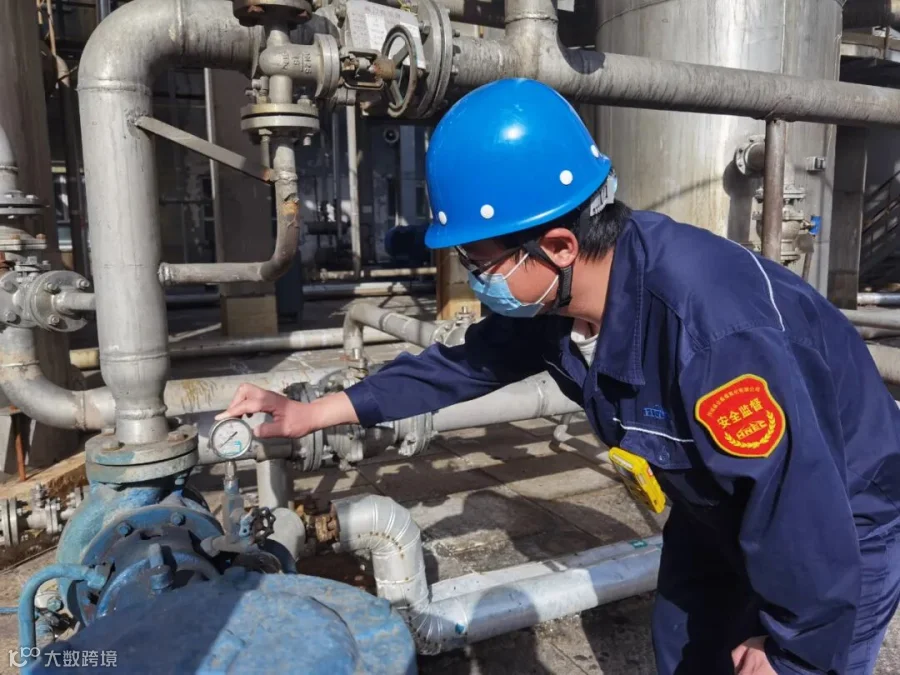 11月10日,众泰煤焦化化产二车间,安全员张风琛一边检查硫铵工段母液槽出口压力是否正常,一边叮嘱岗位工认真落实各项安全措施。