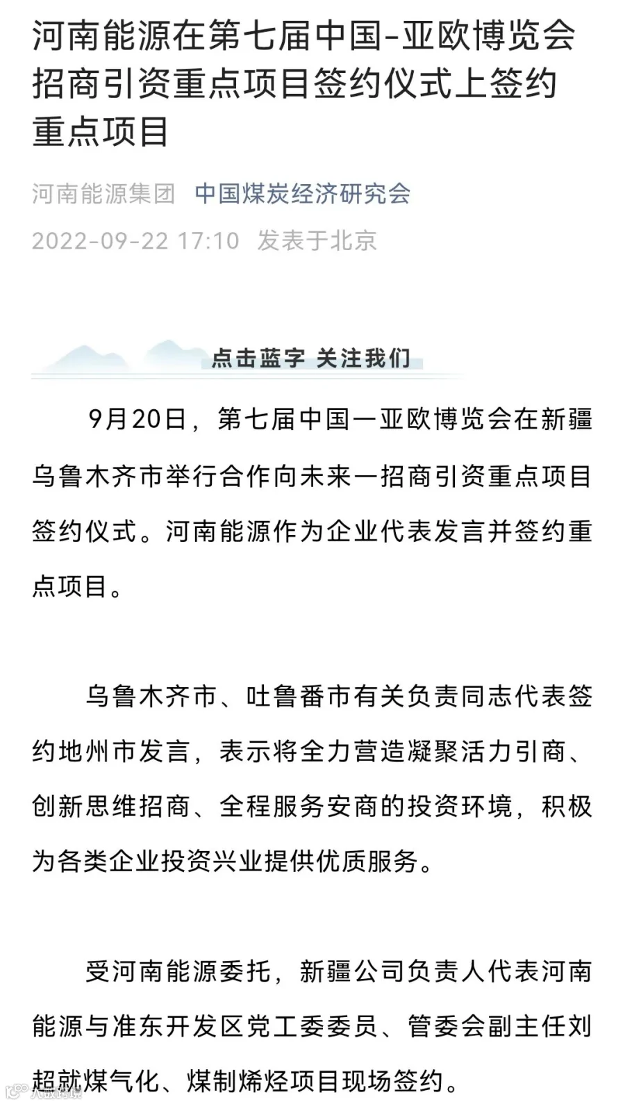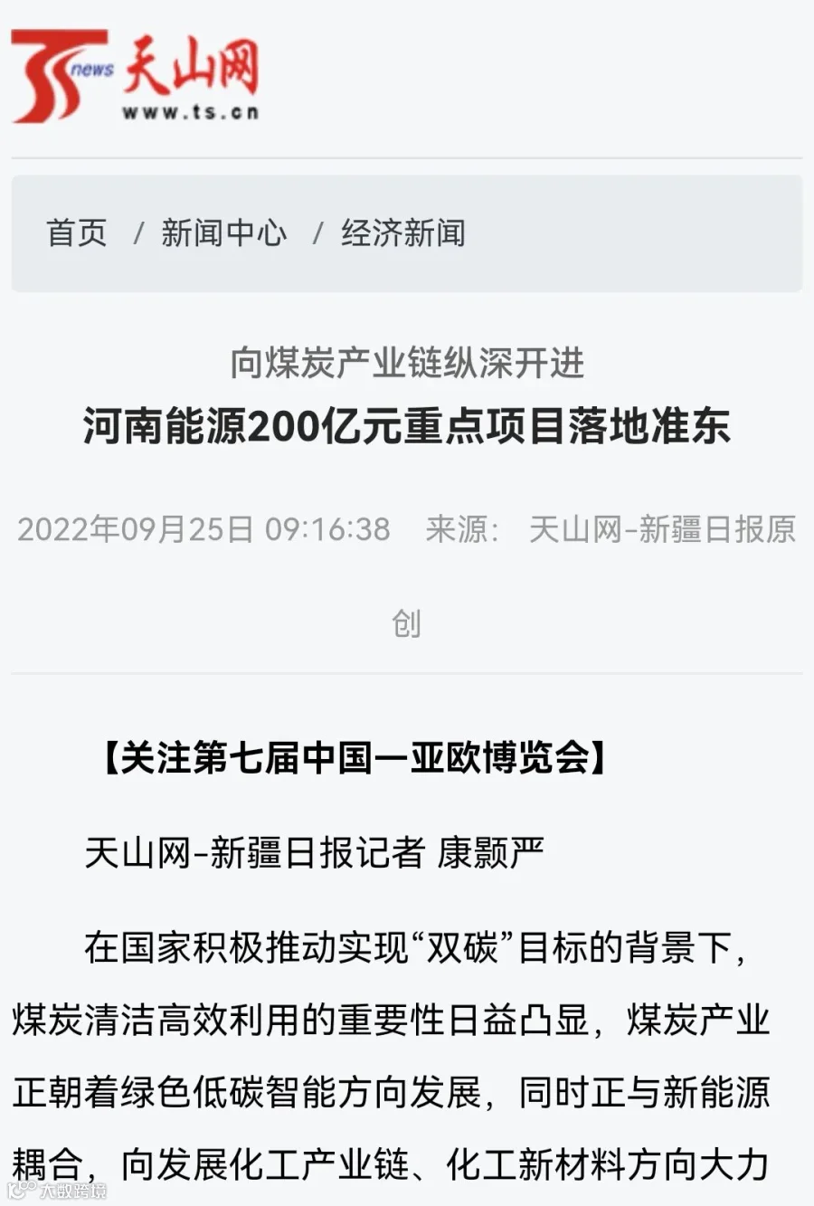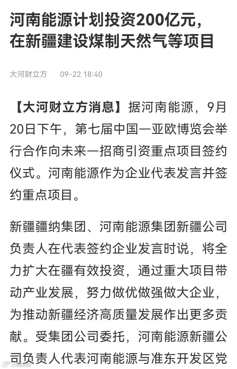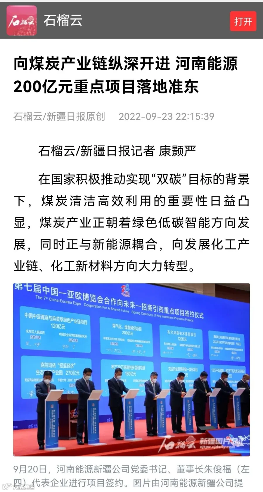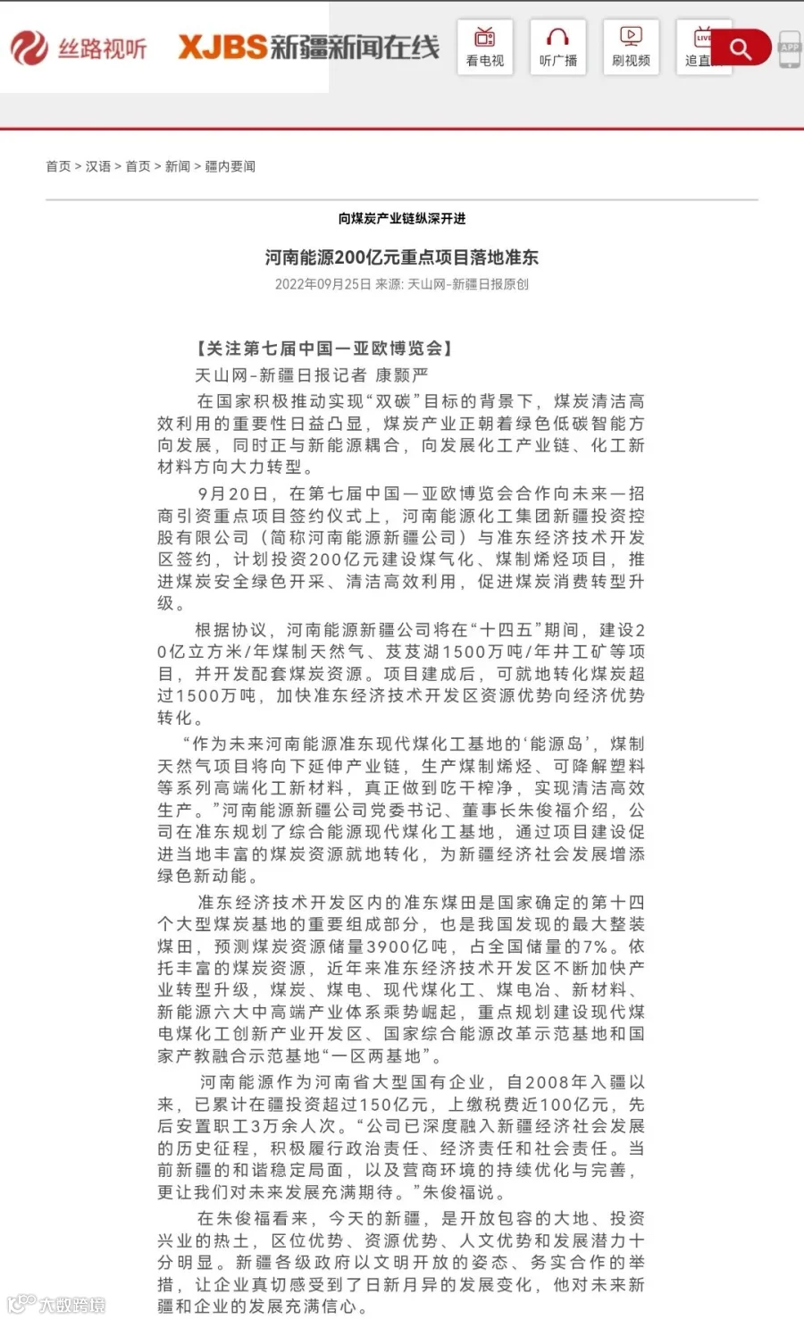 “规划建设综合能源现代煤化工基地是河南能源立足新发展阶段,坚持‘东引西进’战略,走绿色、低碳、循环、可持续发展之路,充分利用准东地区丰富的资源优势,大力拓展煤炭深加工项目,持续为新疆经济社会发展,为实现‘双碳’目标贡献更大力量。”