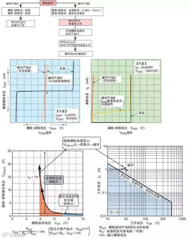 主要有因在栅极和源极之间如果存在电压浪涌和静电而引起的破坏,即栅极过电压破坏和由上电状态中静电在GS两端(包括安装和和测定设备的带电)而导致的栅极破坏。