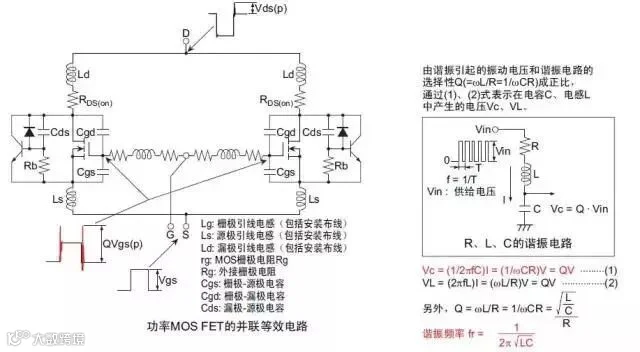 当谐振条件(ωL=1/ωC)成立时,在栅极-源极间外加远远大于驱动电压Vgs(in)的振动电压,由于超出栅极-源极间额定电压导致栅极破坏,或者接通、断开漏极-源极间电压时的振动电压通过栅极-漏极电容Cgd和Vgs波形重叠导致正向反馈,因此可能会由于误动作引起振荡破坏。