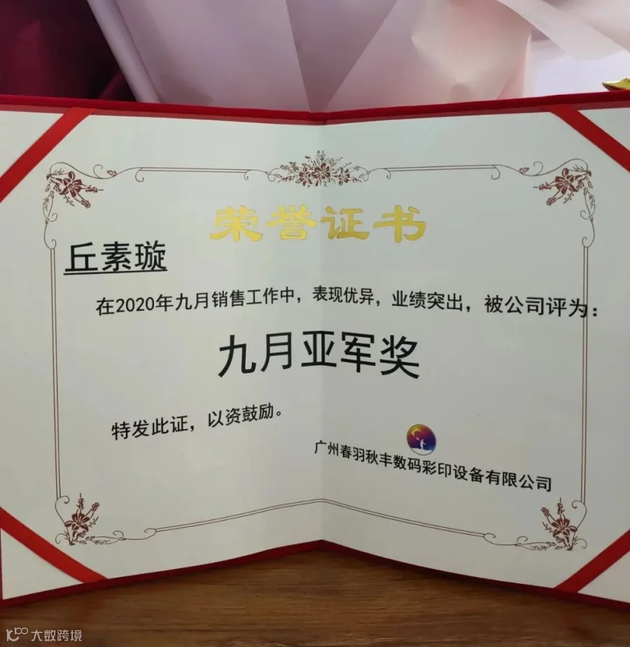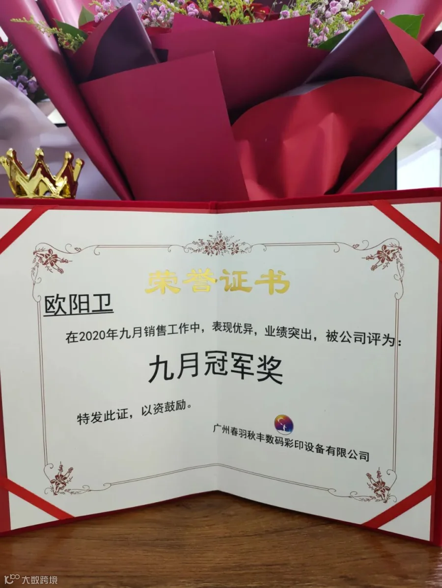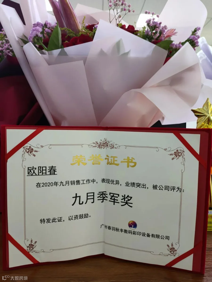 。下面我们掌声有请总经理肖总为销售亚军颁发证书、奖杯、 奖金、鲜花,希望丘素璇同事能够在接来下的是十月份,夺得销售冠军奖!