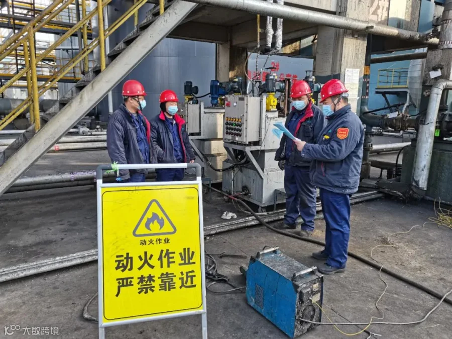 2月10日,众泰煤焦化安全员对化产一车间一级动火作业破乳剂加药箱焊接隔板进行特殊作业前安全检查。