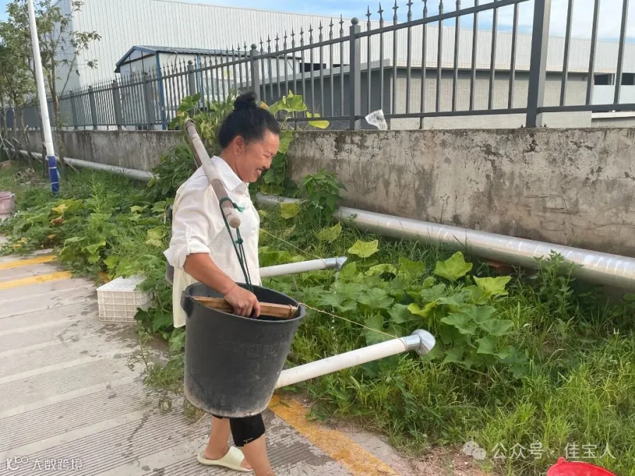而种下这些果蔬的佳宝人,正专注地施肥、浇水,为沉睡了一夜的瓜果蔬菜注入新的活力,让它们在即将到来的日子里更加茁壮成长。