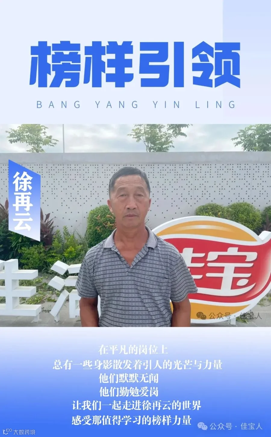 徐再云,男,贵州施秉人。2024年3月入职广东佳宝集团有限公司,现任行政后勤人员,工作努力、勤勉爱岗。
