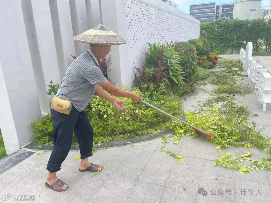 每当绿化工作人员修剪完绿植之后,他便立马将地上的残留枝叶打扫干净,以防堆积,时刻保持干净整洁。