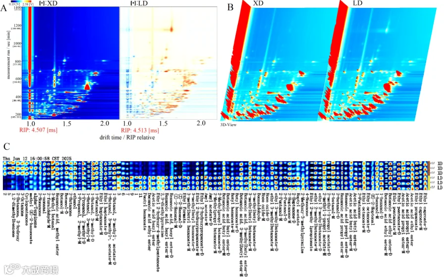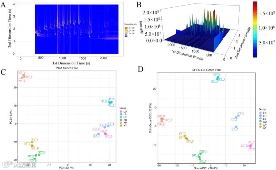 本研究以两种不同发酵期、三个质量等级的金裕馥香白酒为样品,通过全二维气相色谱飞行时间质谱(GC×GC-TOF-MS)、气相色谱-离子迁移谱(GC-IMS)等检测到大量的挥发性香气成分,基于主成分分析(PCA)和正交偏最小二乘判别分析(OPLS-DA)表明不同质量等级金裕馥香白酒间的挥发性香气成分的类别和含量均存在显著差异。