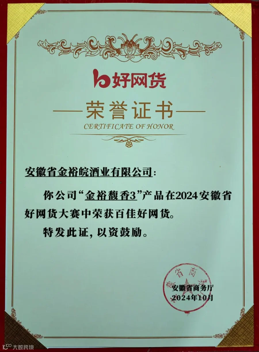 此次荣获“安徽省百佳好网货”,是消费者对金裕馥香3的信赖与认可,也是公司坚持创新、传承非遗技艺和注重消费者服务的成功体现。未来,我们将以金裕馥香3荣获“安徽省百佳好网货”为起点,继续在电商领域精耕细作,让更多的消费者跨越地域的限制,品味到低醉、健康的优质美酒,让白酒这一传统文化在互联网时代焕发出新的生机与活力。