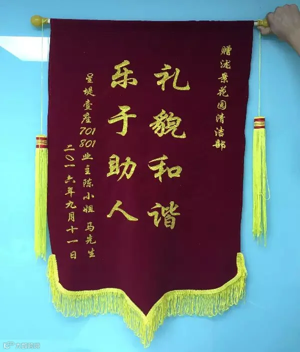佛山泷景花园1座701、801室的业主陈小姐和马先生将一面提有“礼貌和谐、乐于助人”的锦旗送到了我司泷景项目的清洁部手中,感谢清洁人员细致入微、尽心尽责的贴心服务。