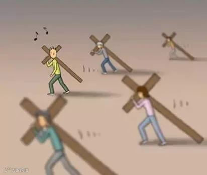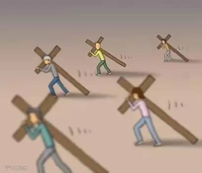 第一幅漫画中,每个人都背负着一个沉重的十字架,在缓慢而艰难地前行!