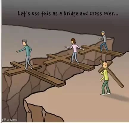 后面的人都慢慢地赶上来了,他们用自己背负的十字架搭在沟上,做成桥,从容不迫地跨越了沟壑。