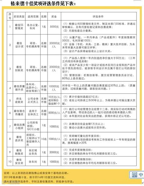 奖励采取精神鼓励和物质奖励相结合的原则,分为:月度优秀员工奖、年度优秀员工奖、项目改善奖,具体评选办法参见《格来德十佳评选管理办法》、《项目改善管理办法》。