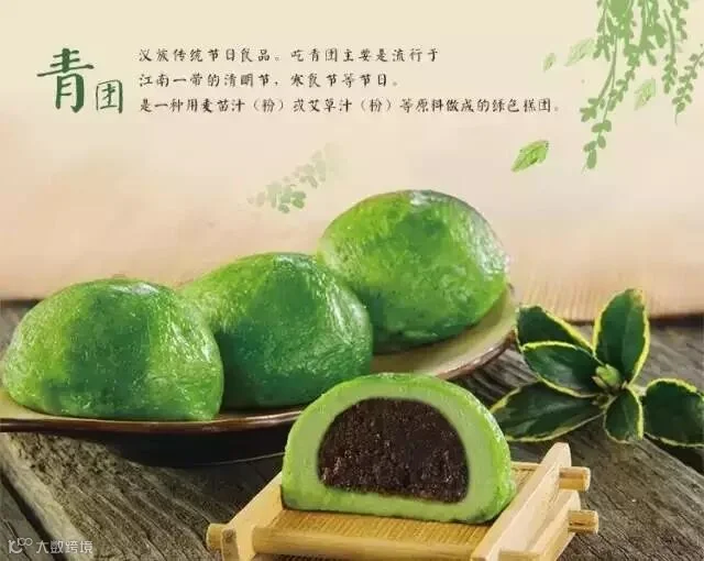 青团,又叫艾团,是一种用草头汁做成的绿色糕团。青团碧青油绿,糯韧绵软,甘甜细腻,清香爽口。青团是流行于江浙一带的清明节节日食品,用青艾的汁与糯米粉一起调和,将豆沙馅、芝麻馅等馅料包入,做成一个个如小孩子拳头大小的绿色的团子。