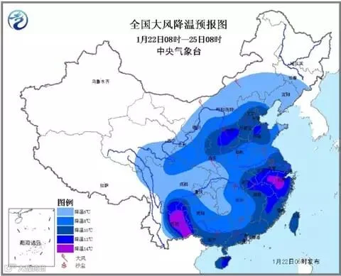 受寒潮影响,22日至25日,我国中东部地区自北向南有强降温和大风天气,大部地区气温将下降6~10℃、局地降温可达12~14℃,并有4~6级偏北风、阵风可达7~8级。华南中北部最低气温将下降至1~-3℃、长江中下游地区降至-7~-13℃、黄淮和华北平原降至-12~-20℃。安徽中南部、浙江西北部、福建西北部、广东北部等地的部分地区最低气温可能逼近或突破历史极值。长江以北地区最低气温出现时间为23日或24日凌晨,长江以南地区最低气温出现时间为24日或25日凌晨。我国中东部地区日最低气温将较常年同期偏低6~8℃,局地超过10℃。
