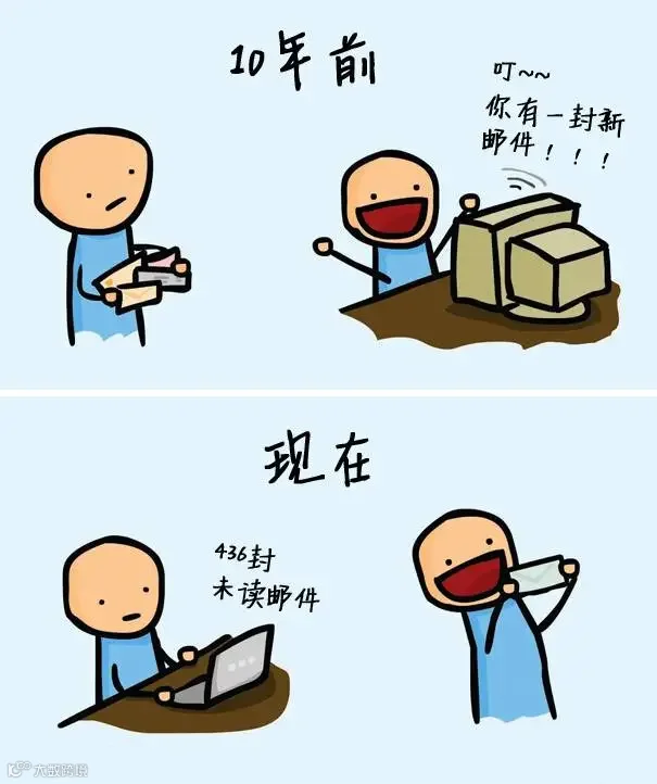 刚学会E-mail,收到一封高兴好半天;现在电子邮箱天天都弹出一大堆邮件,可是连点开的欲望都没有。如果是一封信,肯定会很开心。