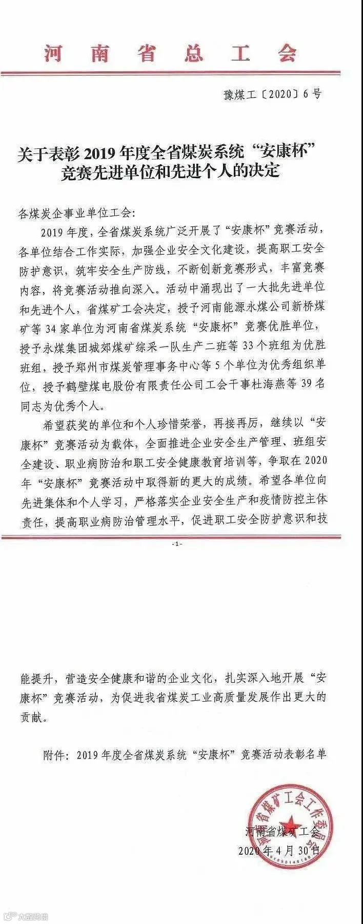 导读:近日河南省总工会发布表彰决定对2019年度全省煤炭系统“安康杯”竞赛先进单位和先进个人进行表彰新疆公司多个集