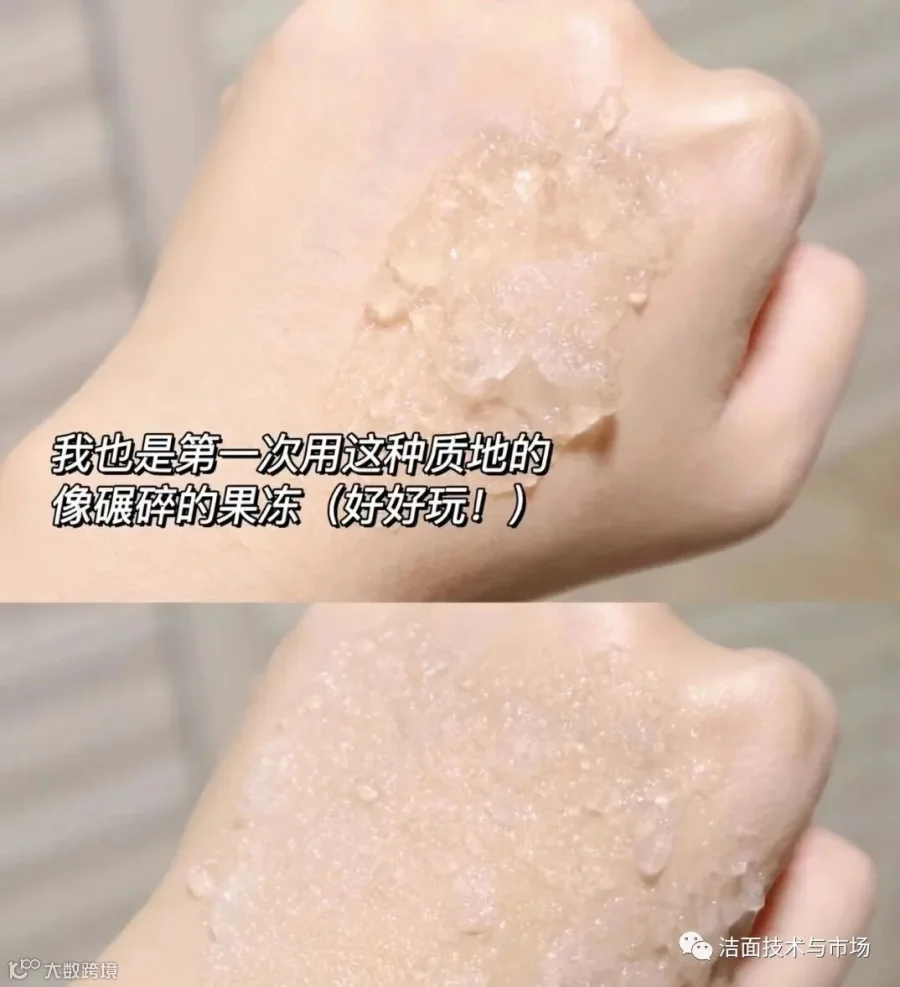 天然的甘露聚糖啫喱颗粒,不伤角质层,在脸上滚动按摩,能够促进面部血液循环,活化细胞。