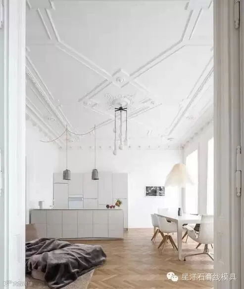 平线,花线,圆盘类,可以单独使用。比如八九十年代中国很多会在房间中间安装石膏圆盘,纯装饰,也会直接在此处安装灯具。大家可能经常见到层高很高,复杂线条的顶角线,木门或墙裙,天花中央还会有圆盘,但家具却很简洁或现代,这类多多是欧洲老建筑,老外不想大搞,就只做了布置家具;