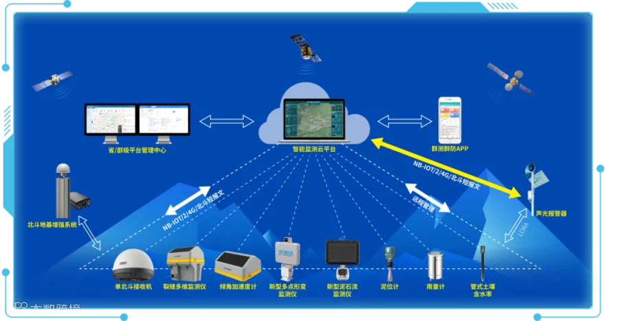 以北斗高精度定位技术为核心,结合多维监测仪、倾角加速度计、新型多点形变监测仪等先进装备,融合本地边缘计算、多模多频高精度定位算法、预警分析、大数据等多种新技术,构建“空天地”多源立体监测体系,提高地质灾害监测预警能力,实现高效、准确、实时智能监测预警。