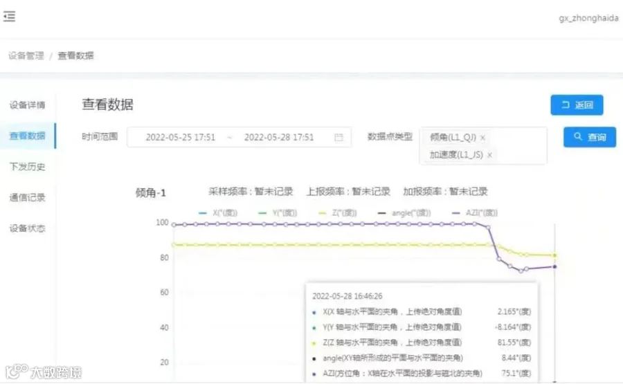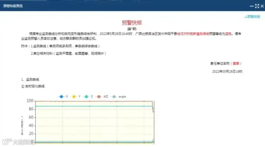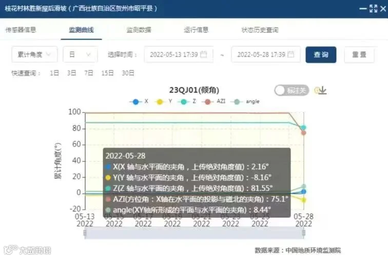 5月28日,监测人员通过中海达地质灾害监测系统发现,广西壮族自治区贺州市昭平县文竹镇桂花村一处屋后滑坡的01QJ01(倾角),前1日三轴倾角变化速率最大值竟达到6度/日。这是一个危险的信号,专业监测预警人员立马发起预警快报。