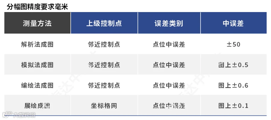 ◎图根点:图根点相对于邻近控制点点位中误差不大于图上±0.1mm,高程精度为1/10等高距。在航空摄影测量中,像控点的精度类同于图根点,其点位中误差取地物精度(后述)的1/5,高程精度也是1/10等高距。
