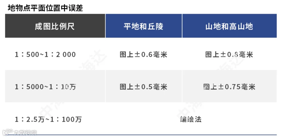 中小比例尺地形图相对于邻近控制点的地物点点位中误差不应大于图上±0.5mm,特殊或困难地区(山地,高山地)不能大于图上±0.75mm。