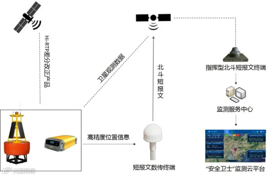 通过GNSS接收机接收卫星导航系统信号及中海达Hi-RTP精密产品(轨道、钟差等)进行高精度解算及数据处理,实现动态厘米级定位,并通过北斗短报文数传终端将监测信息回传至监测服务中心进行展示,为预防自然灾害、科学研究以及海洋设备监管调度等提供相对应的决策依据。