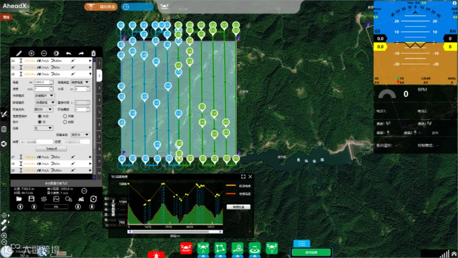 起飞作业,自动化航线安全检查,保证无人机能长时间处于匀速状态,并现场勘查测区范围内是否存在高塔、电塔等建筑物,在确保安全飞行的条件下,进行仿地飞行作业。