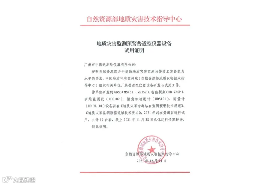 中海达以出众的自主研发能力、丰富的案例经验、强大的规模化生产能力,依据《地质灾害监测通讯技术要求》和《地质灾害专群结合监测预警技术指南(试行)》等相关标准,积极参与此次地质灾害监测设备野外试用工作,在众多的生产厂商中脱颖而出,获得自然资源部地质灾害技术指导中心颁发的试用证明及认可。