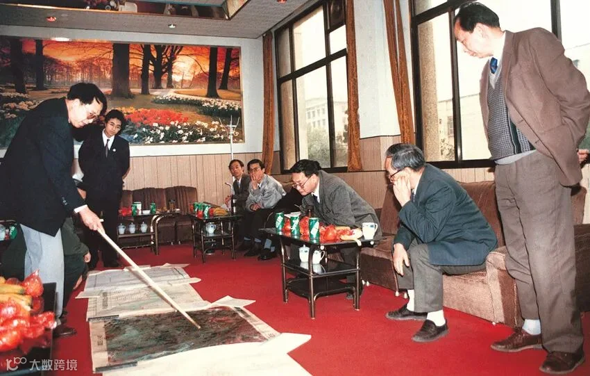 ▲1998年长江中游发生大水,许厚泽(右三)向农业部洪绂曾副部长汇报工作