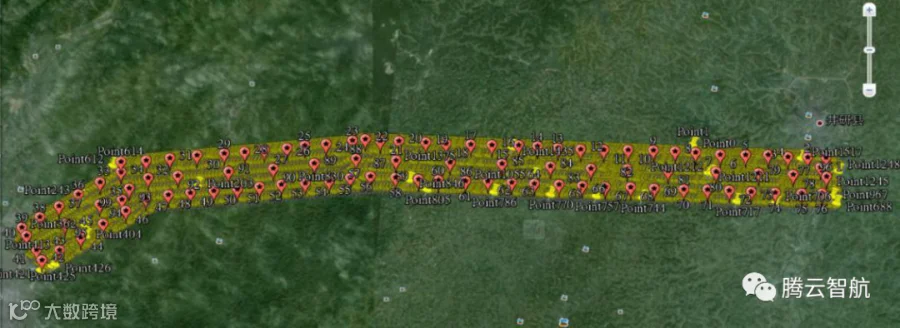 此项目是我国西南某地高铁建设前,进行线路勘测,项目所需成果为1:2000地形图。项目航测区域为一个不规则条带状区域,长度约70公里,该地地形为丘陵地区。采用中海达无人机飞行平台iFly V10搭载正摄相机Z130进行拍摄。平均相对航高600米。航测区域如下图所示。