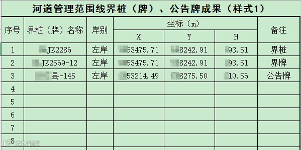 ▲河道管理范围划界界桩(牌)坐标、高程、地理位置成果图