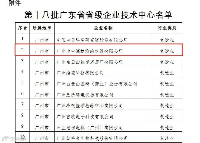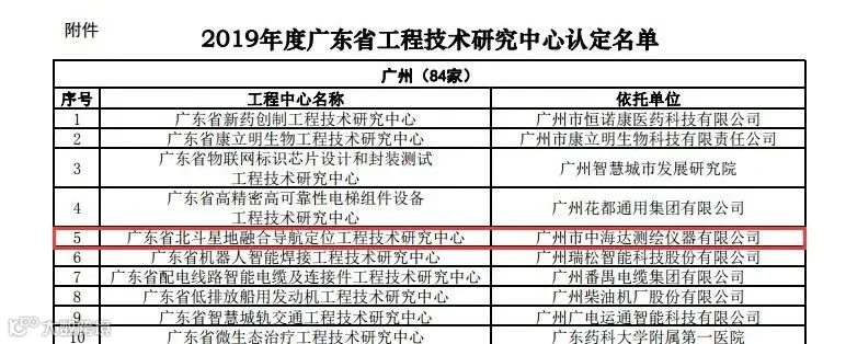 2019年11月15日广东省工业和信息化厅发布了第十八批广东省省级企业技术中心的认定名单,中海达测绘公司荣登榜单。