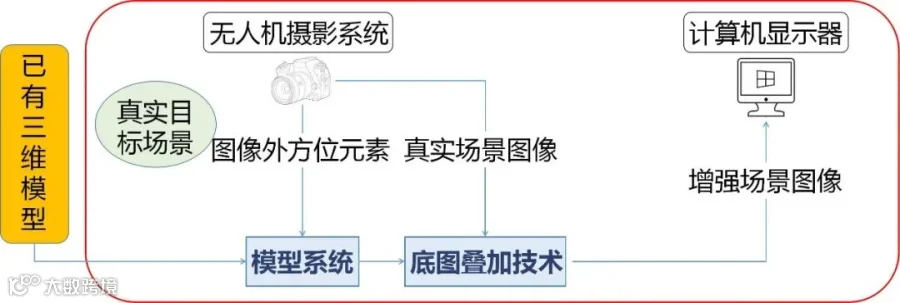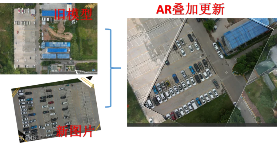 AR叠加技术主要面向弱测绘领域,通过AR叠加技术,主要实现在图片上叠加矢量信息,将图片矢量化,在叠加成果上快速实现坐标点拾取、并可进行矢量化测量,比如距离、高度、面积、体积等测量。AR叠加技术分为实时叠加和事后叠加,实时叠加为在原有底图上叠加实时飞行的照片,事后叠加为利用航拍照片生成模型后,再在模型上叠加此次飞行的航拍照片。