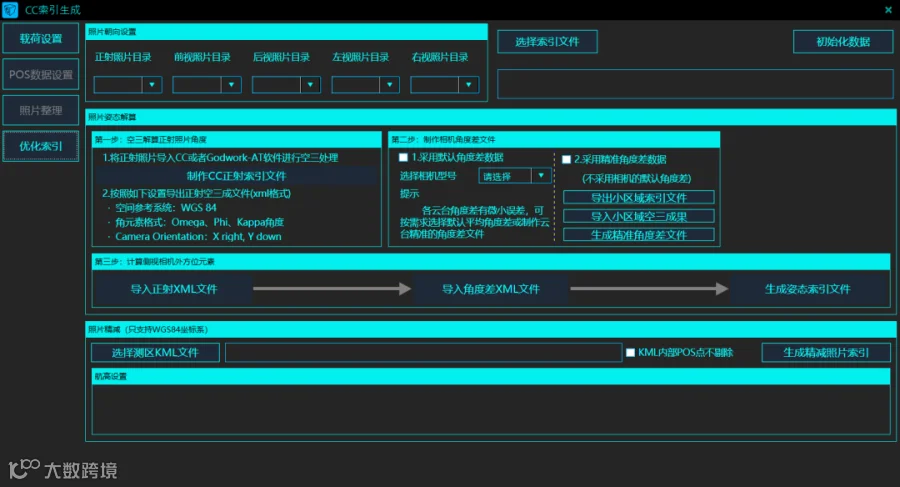 设置相机位置对应的文件目录,制作正射镜头索引文件,经过软件空三计算后根据要求导出。选择任一种方式提取角度差文件,导入正射kml文件,导入角度差文件,生成姿态索引文件,导入软件中即可预测出控制点位置,方便刺点,提高效率。