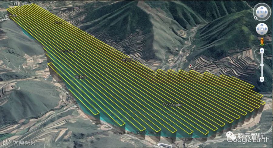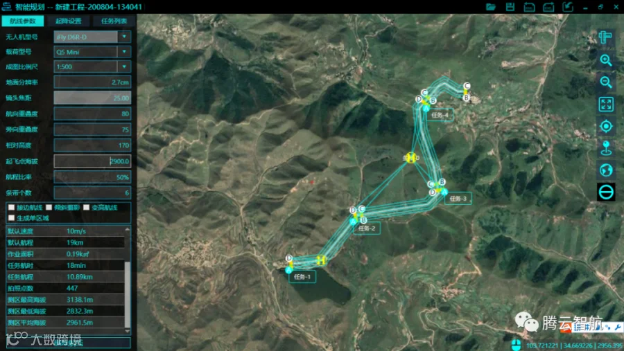 iFly智能航测助手设置地面分辨率、航向重叠率、旁向重叠率、基准面海拔后,一键式生成最优航线。本项目导入测区范围线kml后一键生成航线。该区域最高海拔为3229米,最低海拔为2913米。测区地处山区,地形起伏大,采用航向80%、旁向75%的大重叠度飞行,数据经CC处理后得到测区高精度三维模型。