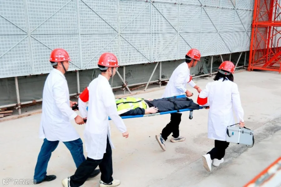 在模拟突发强对流天气预警的紧张氛围中,演练设定了一名工人在加固教学楼外脚手架时不慎坠落,导致右腿小腿骨折及多处擦伤的紧急情景。随着现场的紧急呼叫,“有人坠落了!”项目管理人员迅速启动三防应急救援预案,指挥现场人员迅速行动,对伤员进行初步救治并及时联系120急救中心。整个过程体现了快速响应、专业救援与高效协调的能力,成功保障了伤员的生命安全。
