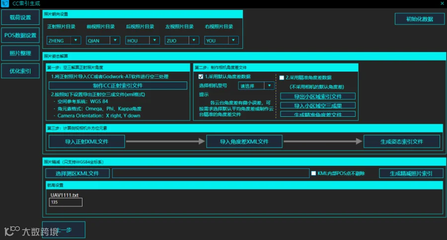 上图为数据整理模块。“iFly 智能航测助手”可对五相机数据进行统一拷贝并生成CC工程索引文件。并且其拥有删片功能,该功能能使不在建模范围内的照片不参与索引文件生成,从而优化内业建模空三的处理时间,还可以对照片进行姿态赋予,减少了内业工作量,加快了内业工作效率。