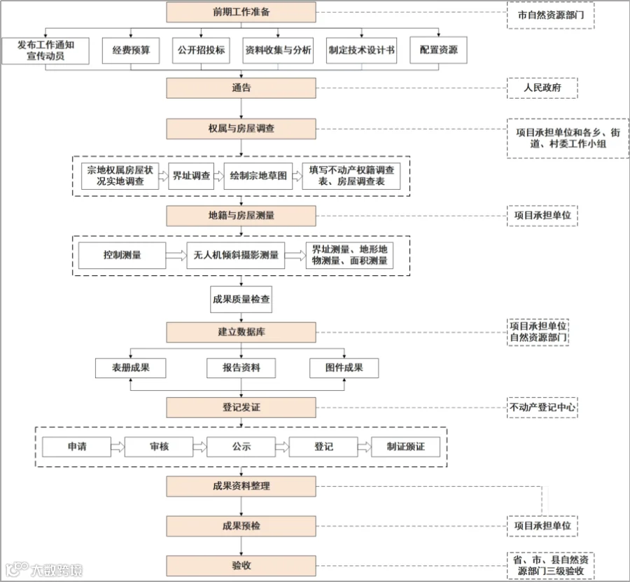 房地一体是一项内外业一体的测量调查工作,其工作流程主要包括准备工作、权属调查、地籍测量、房屋调查和成果归档与建库等五大步骤。